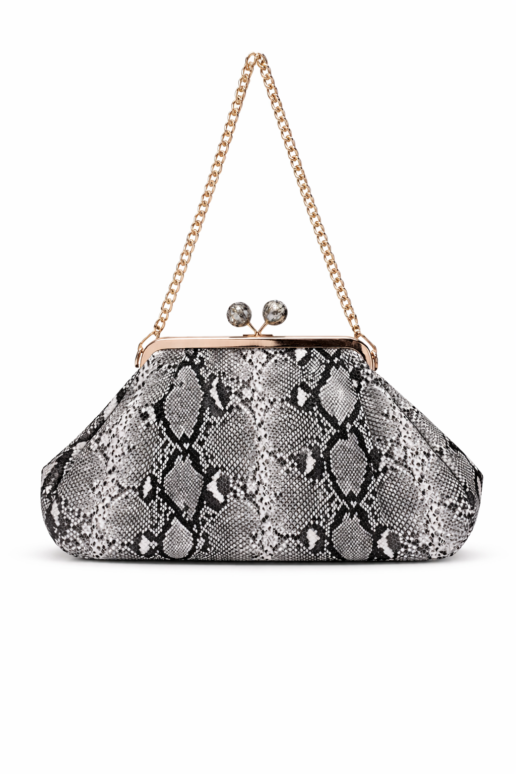 Karakteres mintázatú alkalmi táska, amely elegáns fémcsatjával és láncos pántjával különleges hangsúlyt ad az esti megjelenéseknek. A csat finom fényével és a mintázat határozott rajzolatával már önmagában is ékszerszerű kiegészítő.