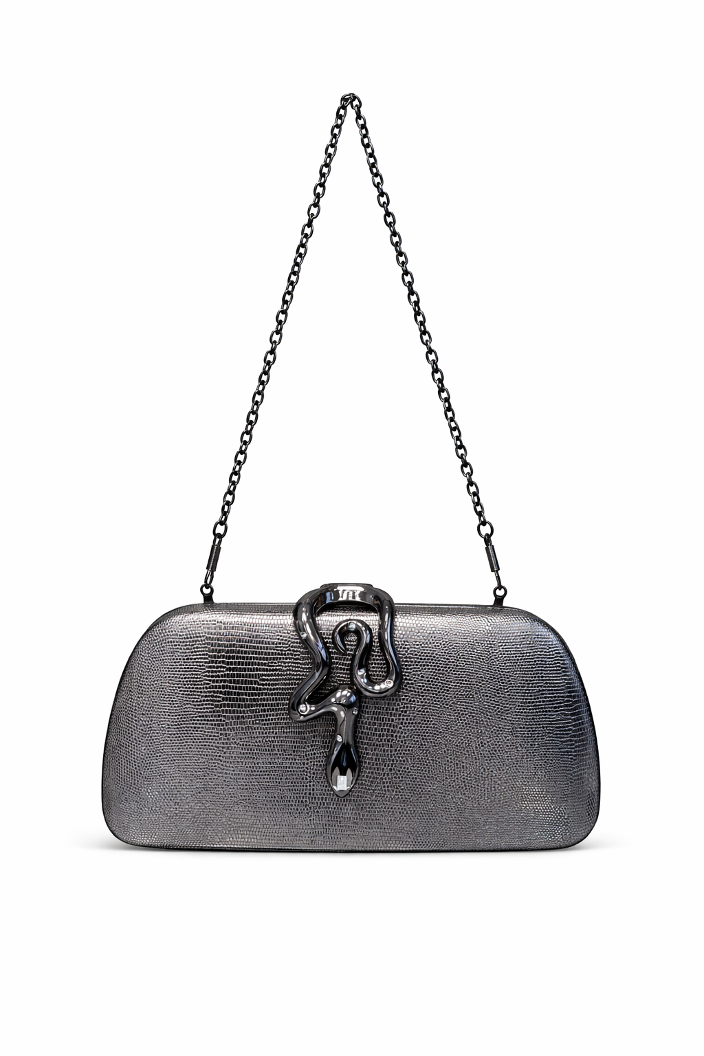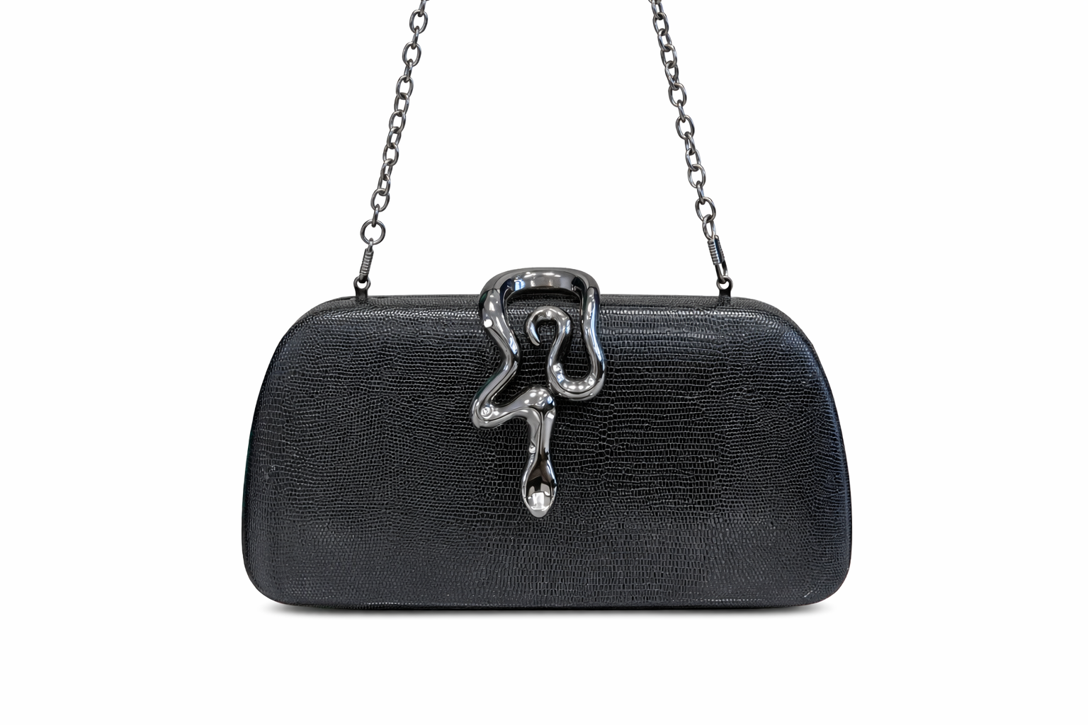 Ívelt formájú alkalmi táska, amely különleges fémcsatjával és finoman texturált felületével visszafogott hangsúlyt ad az esti megjelenésnek. Láncos pántja és arányos kialakítása elegáns, mégis könnyed kiegészítővé teszi ünnepi alkalmakra. Fekete és sötét ezüst színekben kapható.