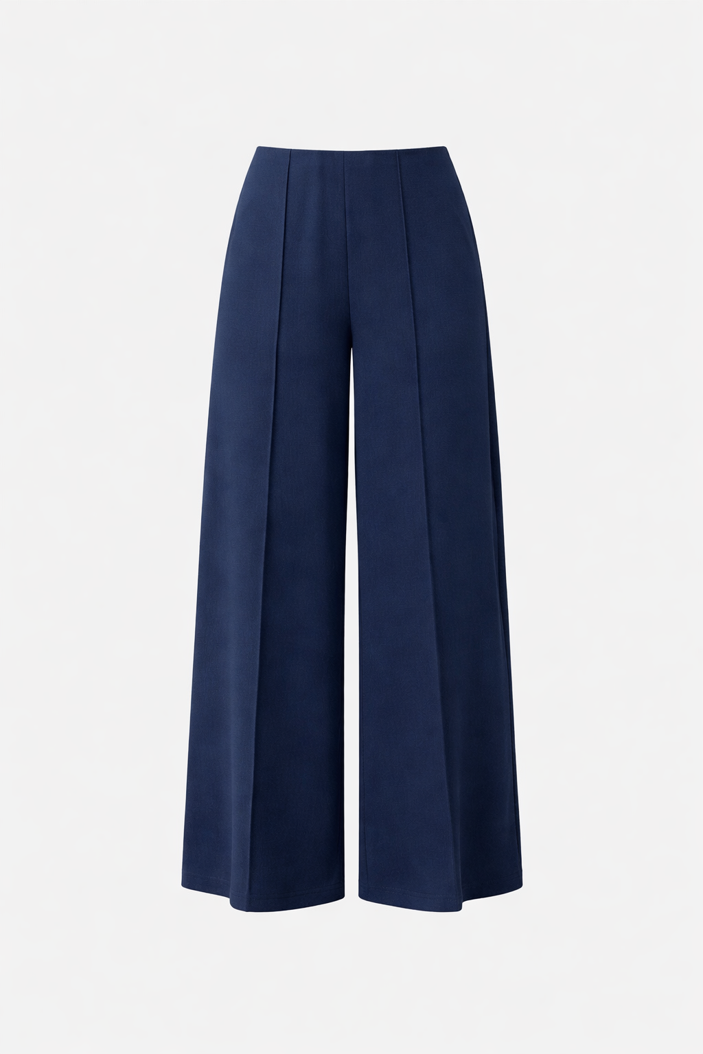 A Delhi bő szárú nadrág, letisztult szabásával a modern női gardrób sokoldalú alapdarabja. A nadrág magas derekú kialakítása szépen hangsúlyozza az alakot, az elején futó hajtások pedig optikailag nyújtják a lábakat. A bő szárú fazon kényelmes viseletet biztosít egész nap. Szabása időtlen eleganciát sugároz, miközben könnyedén kombinálható klasszikus és trendkövető összeállításokhoz egyaránt.