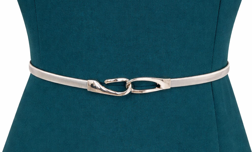 Ez az ékszeröv finoman ívelt, egymásba kapcsolódó formákkal tökéletes választás, ha egy visszafogott, elegáns hangsúlyt szeretnél adni az öltözékednek. Központi díszítése az egymásba kapcsolódó, lágy ívű formákból álló fém elem, amely modern, nőies megjelenést kölcsönöz az övnek.