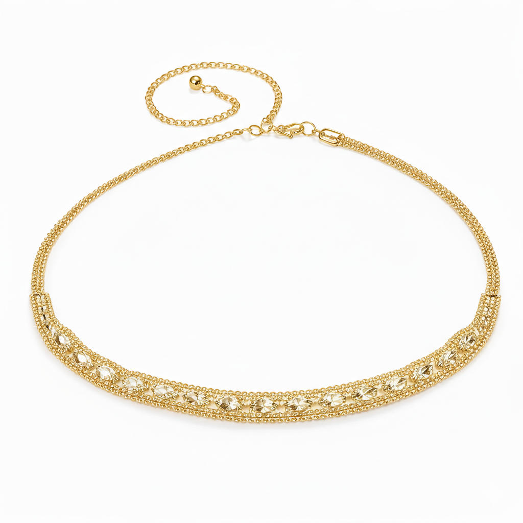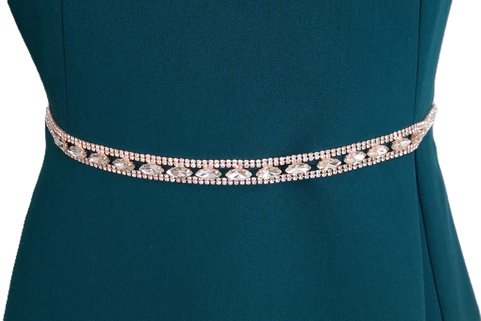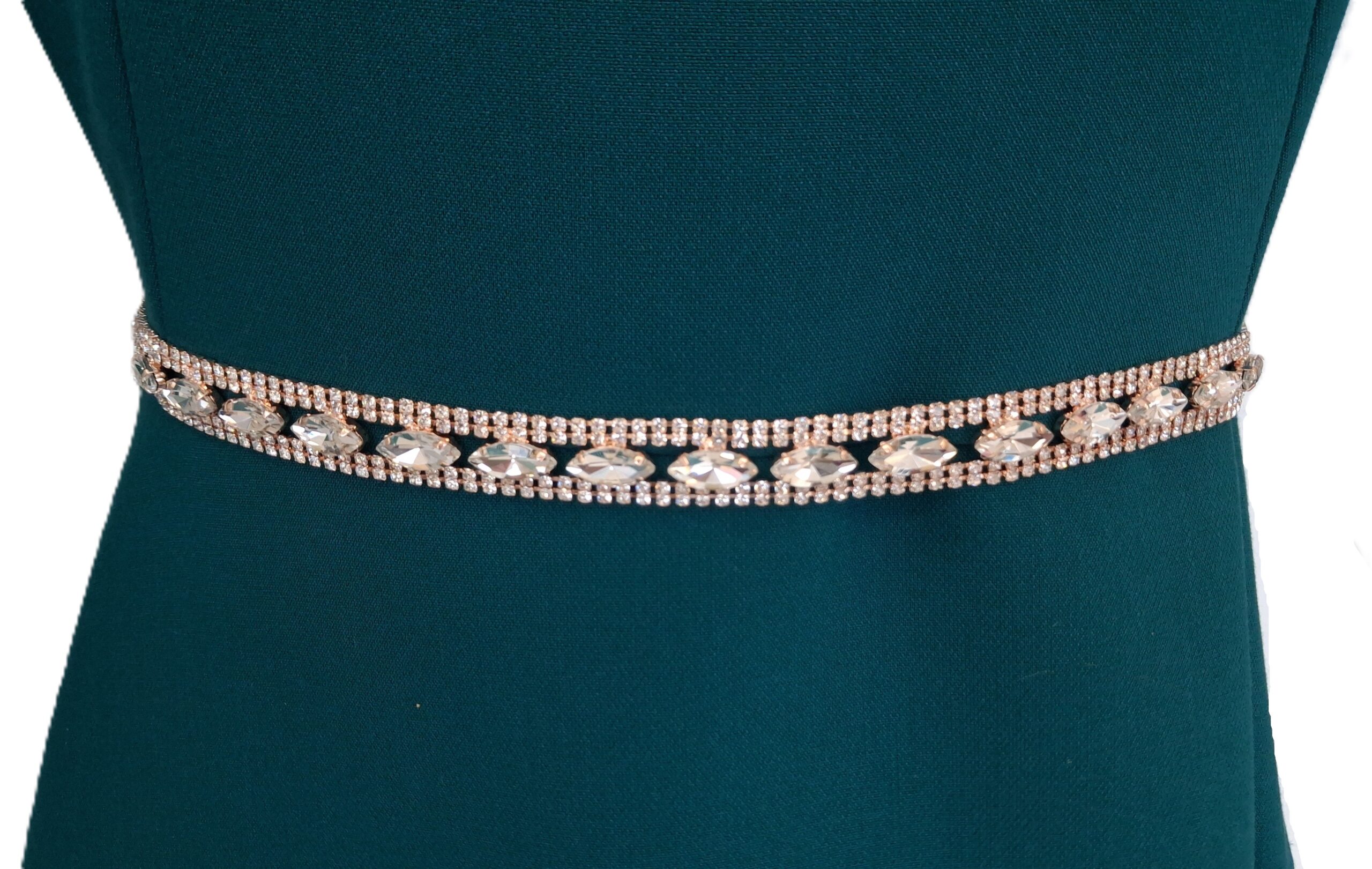 Ez az elegáns ékszeröv köves díszítéssel tökéletes választás azok számára, akik az eleganciát a visszafogott részletekben keresik. Finom kidolgozása és harmonikus fénye diszkréten emeli ki a derekat, miközben nem vonja el a figyelmet az öltözék egészéről. A középső sávban elhelyezett, precízen csiszolt díszítőelemek lágy ragyogást adnak az övnek, amely minden mozdulatnál elegánsan érvényesül.