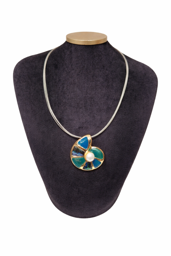 Ez a fülbevaló organikus formavilágával harmonikus és kifinomult összhatást teremt. A kék–zöld, kagylóhatású betétek finoman játszanak a fénnyel, miközben az arany tónusú foglalat elegáns keretet ad a formának. Könnyed viselet, amely egész nap kényelmes marad, mégis különleges megjelenést biztosít. A hozzá tartozó nyaklánccal és gyűrűvel együtt viselve tökéletes szettet alkot, de önmagában is stílusos kiegészítő.