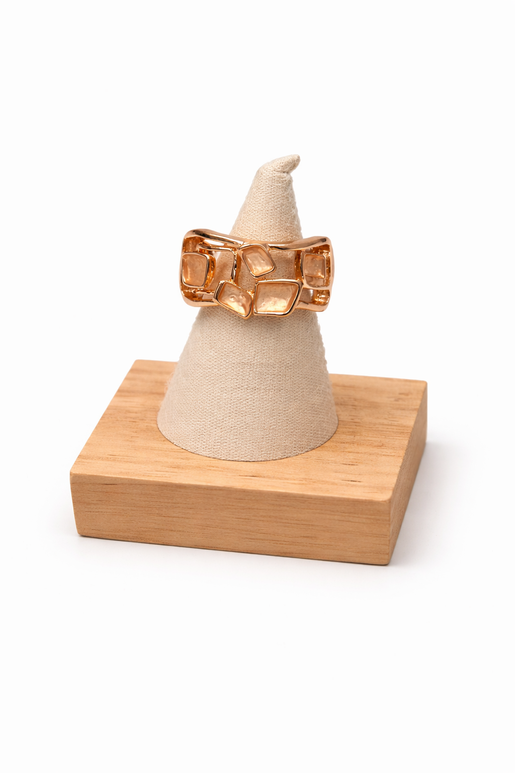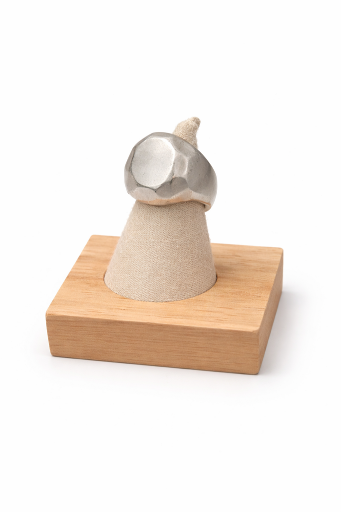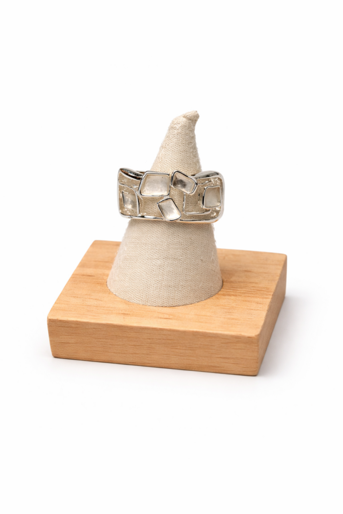 Ez a gyűrű a modern ékszerviselés esszenciáját képviseli. A markáns, mégis kifinomult formavilág mozaikszerű felülettel találkozik, amely különleges fénytörést és egyedi megjelenést ad minden darabnak. Az organikus, enyhén szabálytalan elemek teszik igazán izgalmassá ezt a statement gyűrűt, amely önmagában is elegendő hangsúlyt ad – nincs szükség további ékszerekre. Ideális választás hétköznapi viselethez, de különleges alkalmakon is magabiztos megjelenést biztosít.