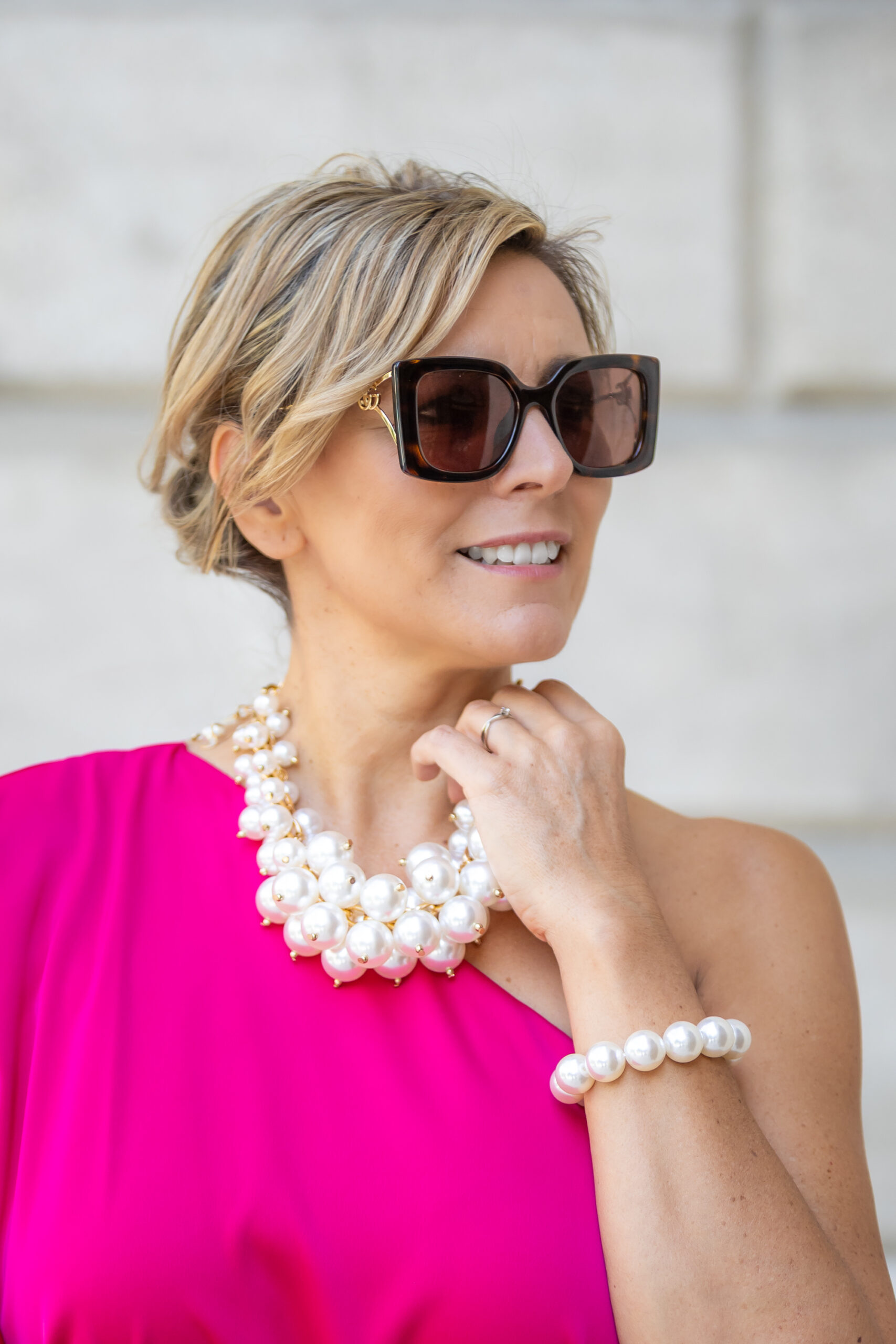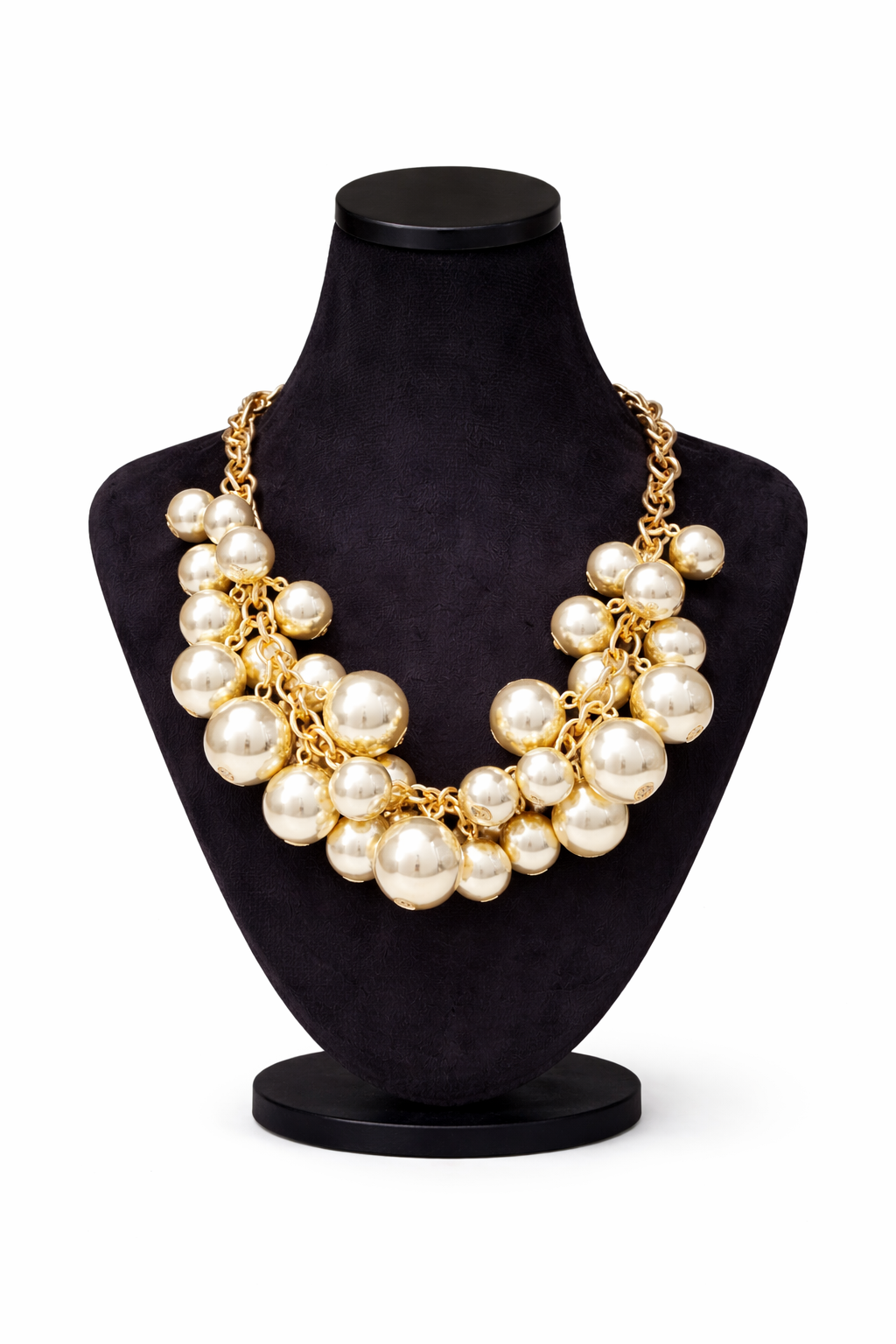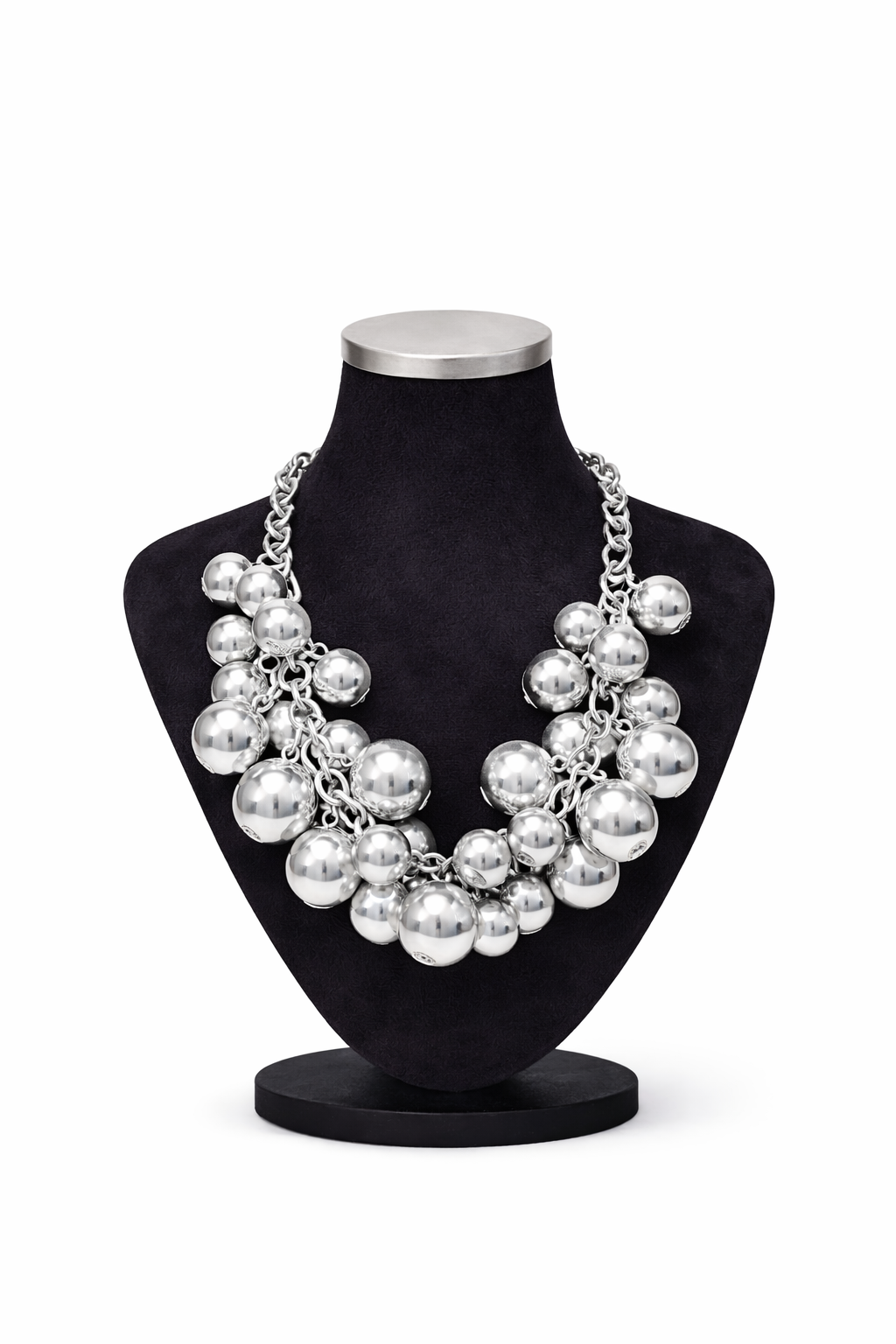 Ez a karakteres gyöngyös nyaklánc fényes felületű, különböző méretű gömbdíszeivel hangsúlyos megjelenést kölcsönöz az öltözéknek. A masszív láncszemek és a gazdag forma modern, nőies összhatást teremtenek, amely egyszerűbb ruhadarabokat is azonnal különlegessé tesz. Delfinkapoccsal záródik, amely biztonságos és praktikus viseletet biztosít.