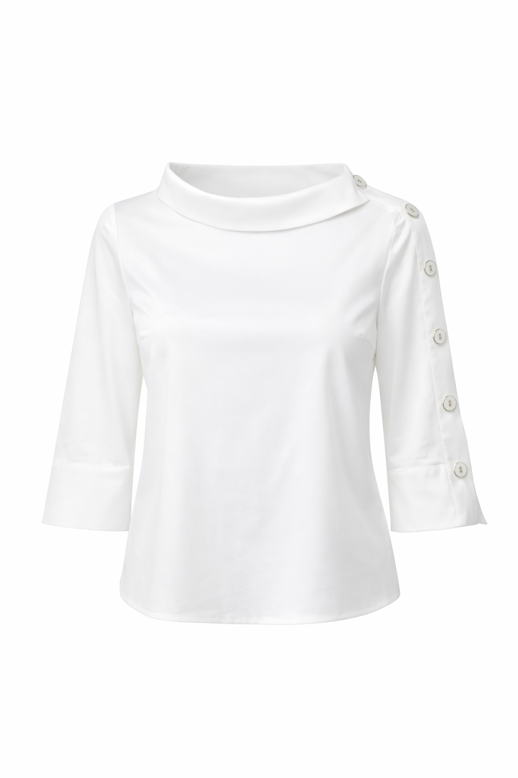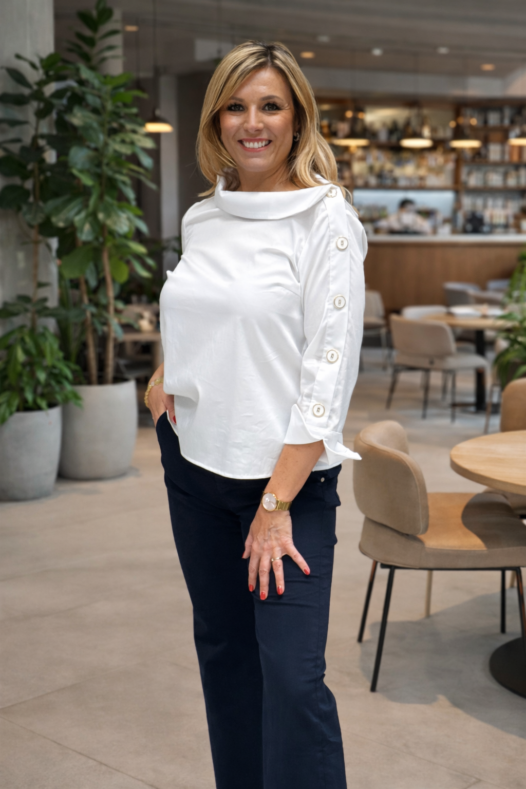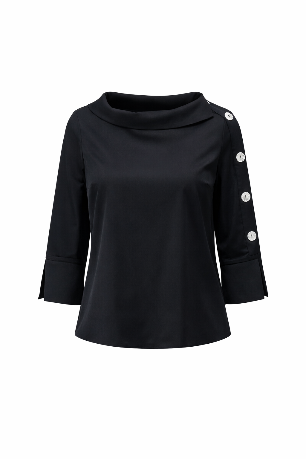 Ezt az állógalléros, hosszú ujjú blúzt a bal oldalán elhelyezett gombdíszítés teszi különlegessé. Kényelmes szabása és lágy esésű anyaga akár egész napos viseletre is ideális: megfelel az irodai munkához és tökéletes az esti, alkalmi megjelenéshez.