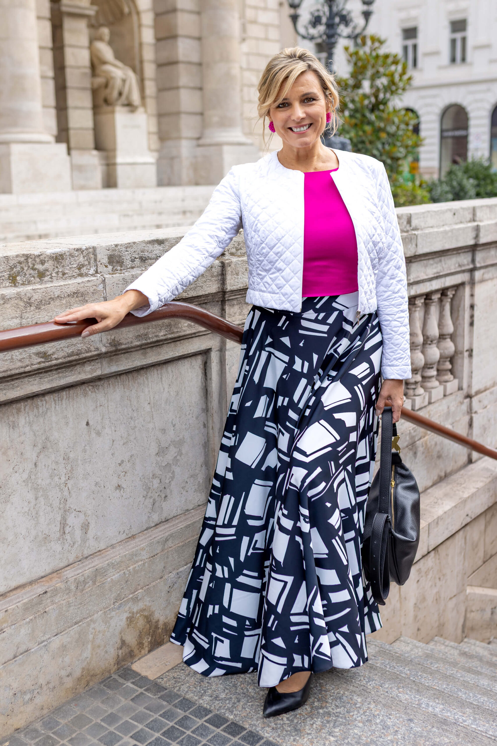 Könnyed esésű, elegáns maxi szoknya, amely légies anyagával és játékos mintájával frissességet visz a mindennapokba. Magas derekú szabása karcsúsít, a bő szoknyarész pedig szabad mozgást biztosít. Tökéletes választás munkahelyre, ünnepi alkalmakra vagy hétköznapi eleganciához. Párosítsd egyszínű blúzzal vagy felsővel a kifinomult megjelenésért.