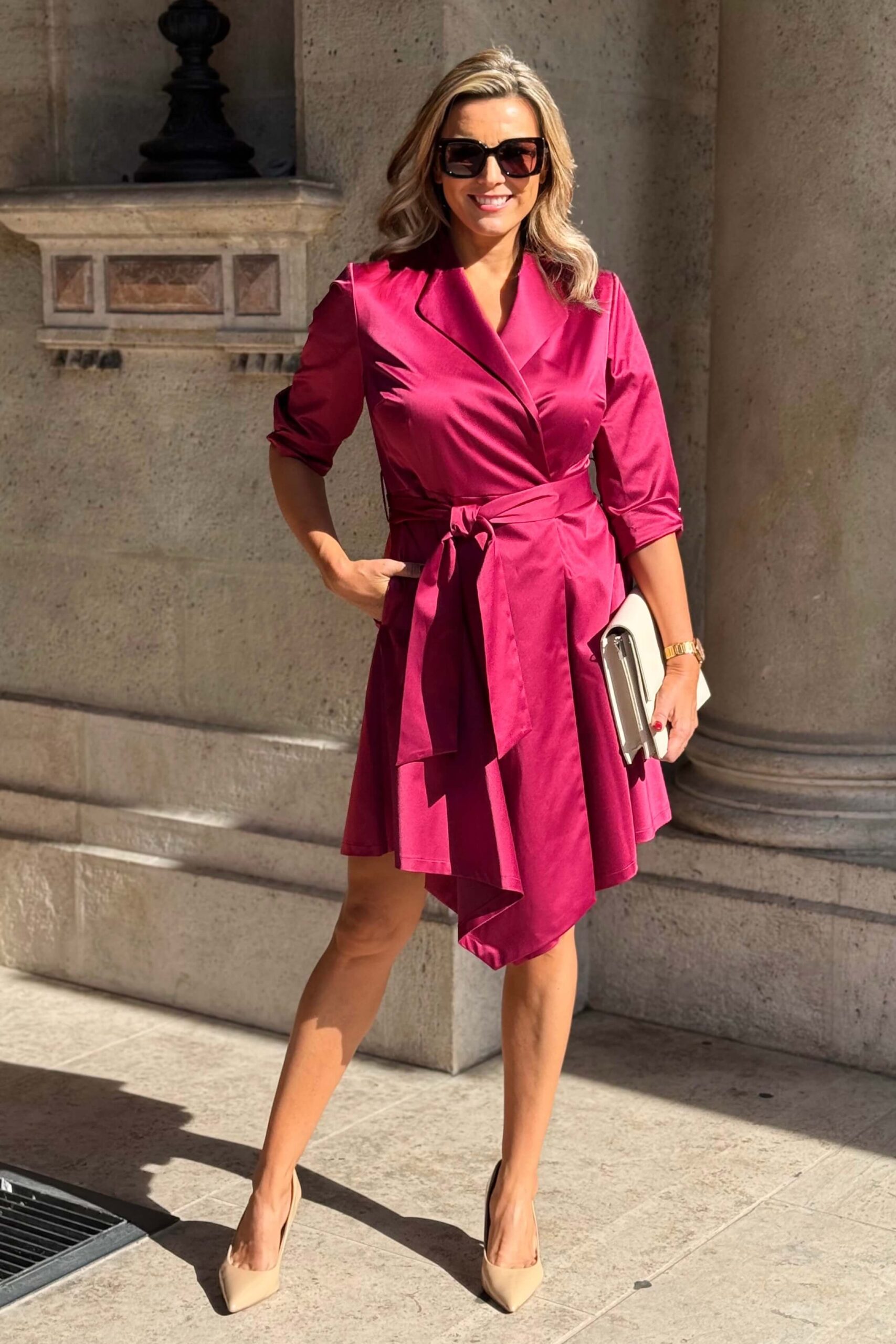Elegáns, szatén fényű átlapolós ruha, mely deréknál megkötős kialakításával nőies sziluettet ad. Az aszimmetrikus szegély játékos könnyedséget kölcsönöz, miközben a klasszikus hajtóka és háromnegyedes ujj stílusos megjelenést biztosít. Sokoldalúsága miatt nemcsak ruhaként, hanem könnyű kabátként is viselhető, így tökéletes választás különleges alkalmakra és hétköznapi eleganciához egyaránt.