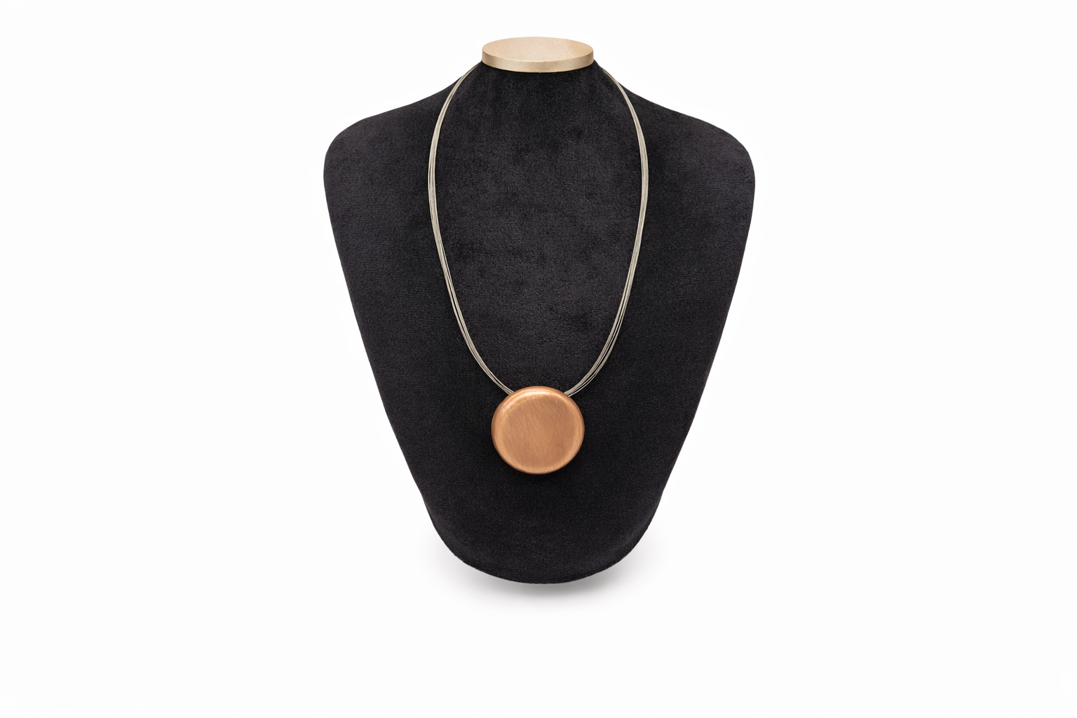 Elegáns, modern nyaklánc, amelyet a letisztult vonalvezetés és a karakteres, kör alakú medál tesz igazán különlegessé. A visszafogott, matt hatású felület időtálló megjelenést biztosít, így a lánc könnyedén illeszkedik hétköznapi és alkalmi szettekhez egyaránt.