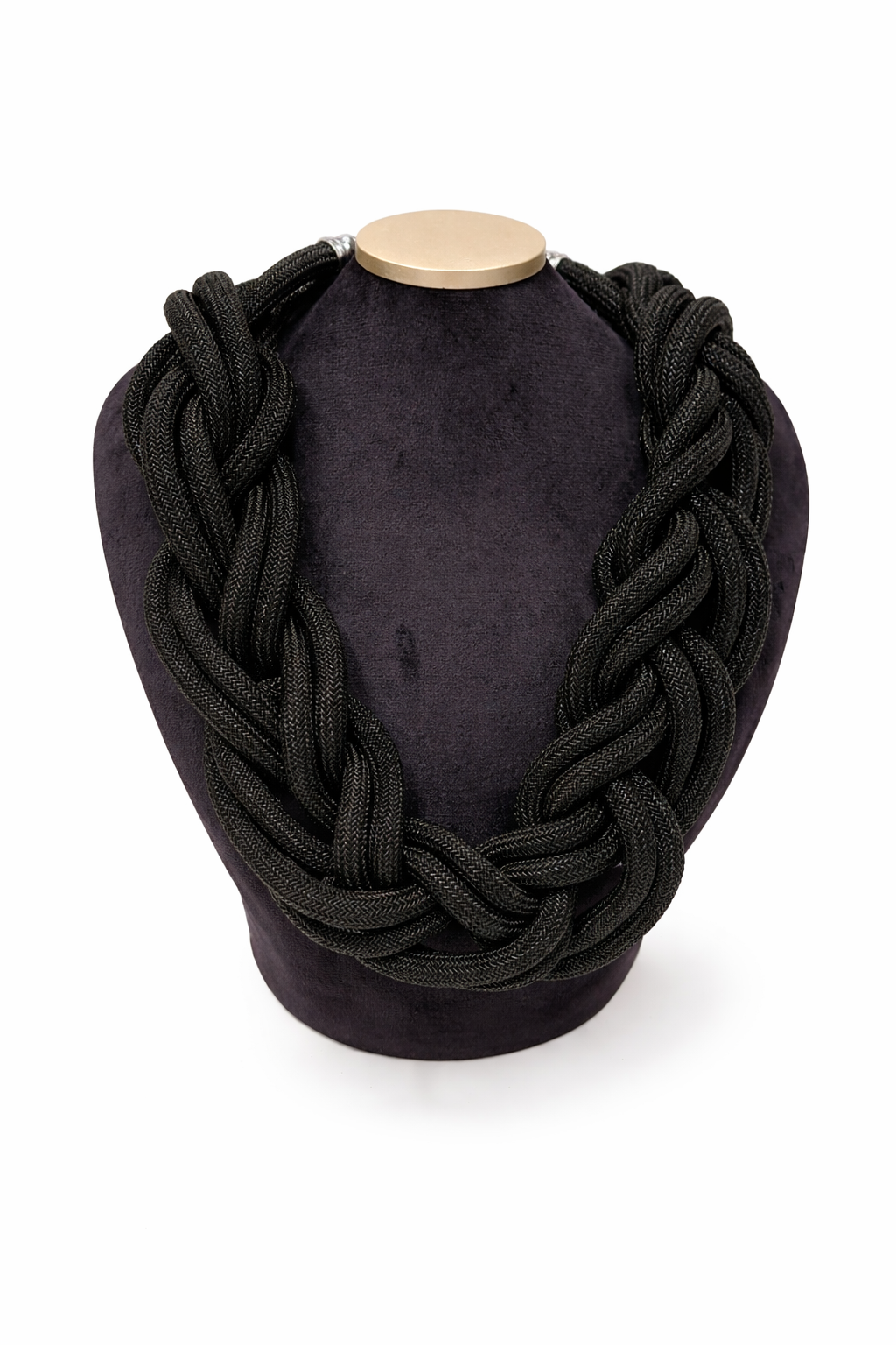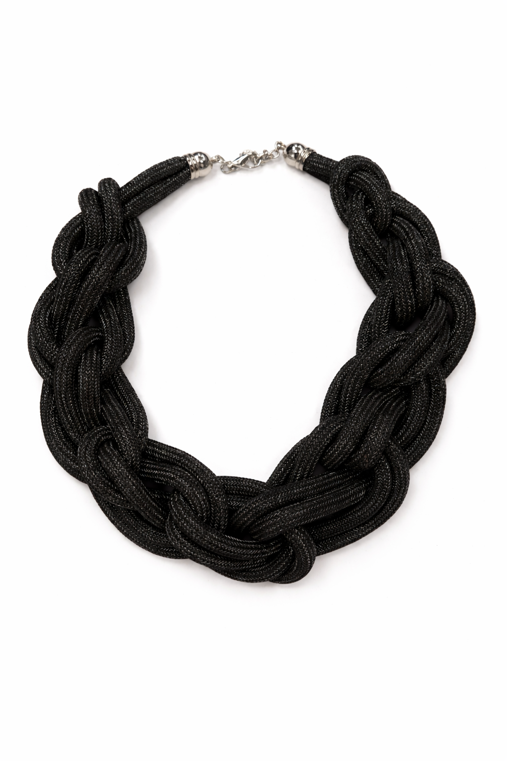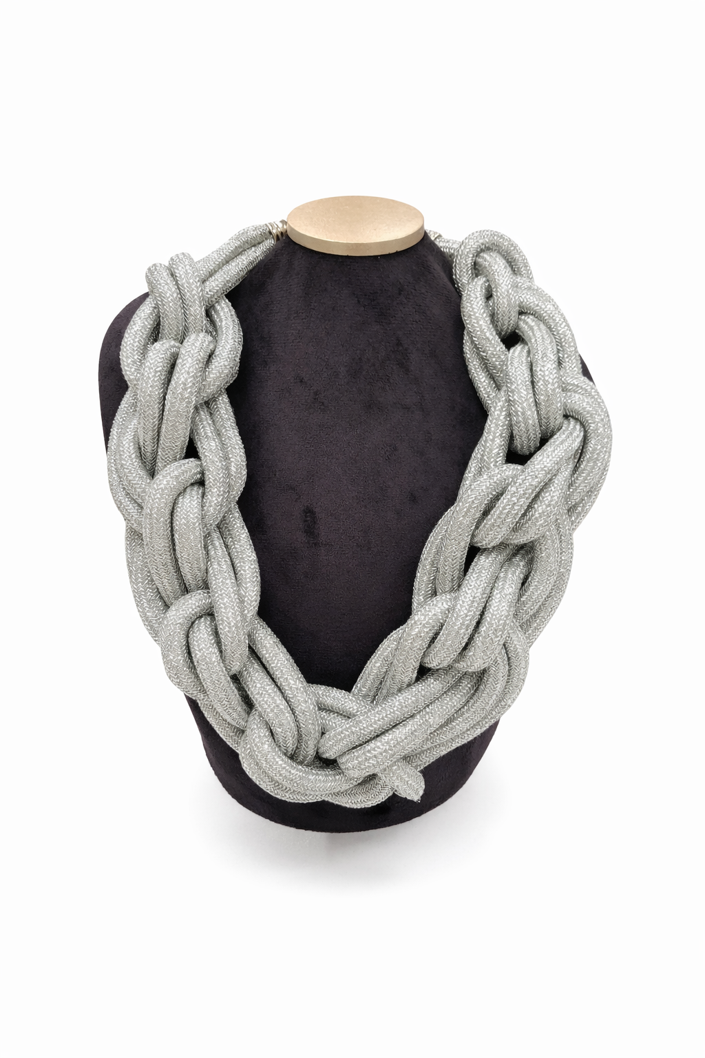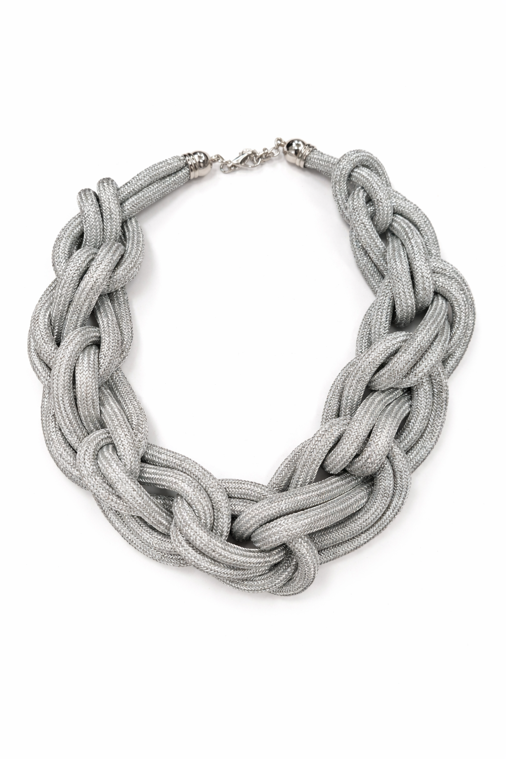 Ez a karakteres nyaklánc vastag, fonott kialakításával azonnal magára vonja a figyelmet. A látványos csomózott struktúra modern és elegáns megjelenést kölcsönöz, miközben a puha, textilhatású anyag kényelmes viseletet biztosít. Önálló darabként is hangsúlyos kiegészítő, amely egyszerűbb ruhákat tesz karakteressé, ugyanakkor alkalmi összeállításokhoz is jól illeszkedik. Delfinkapoccsal záródik, amely biztos és kényelmes viseletet nyújt. Ezüst és fekete színben is kapható.