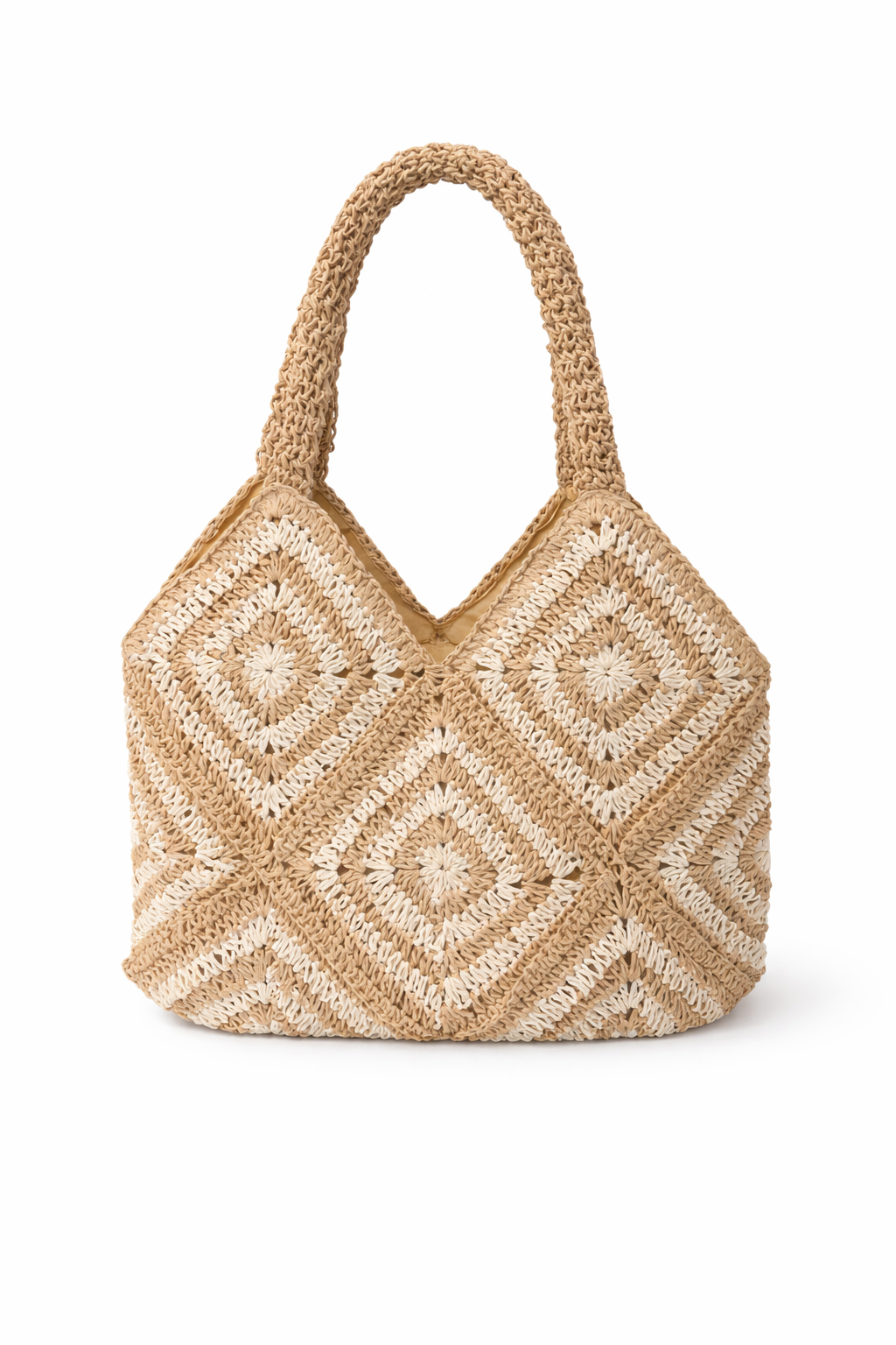 Ez a különleges szalmatáska geometrikus mintával a nyári könnyedség és a letisztult stílus tökéletes találkozása. Természetes árnyalatai és érdekes mintázata finoman vonzza a tekintetet, miközben időtálló darab marad a ruhatáradban.