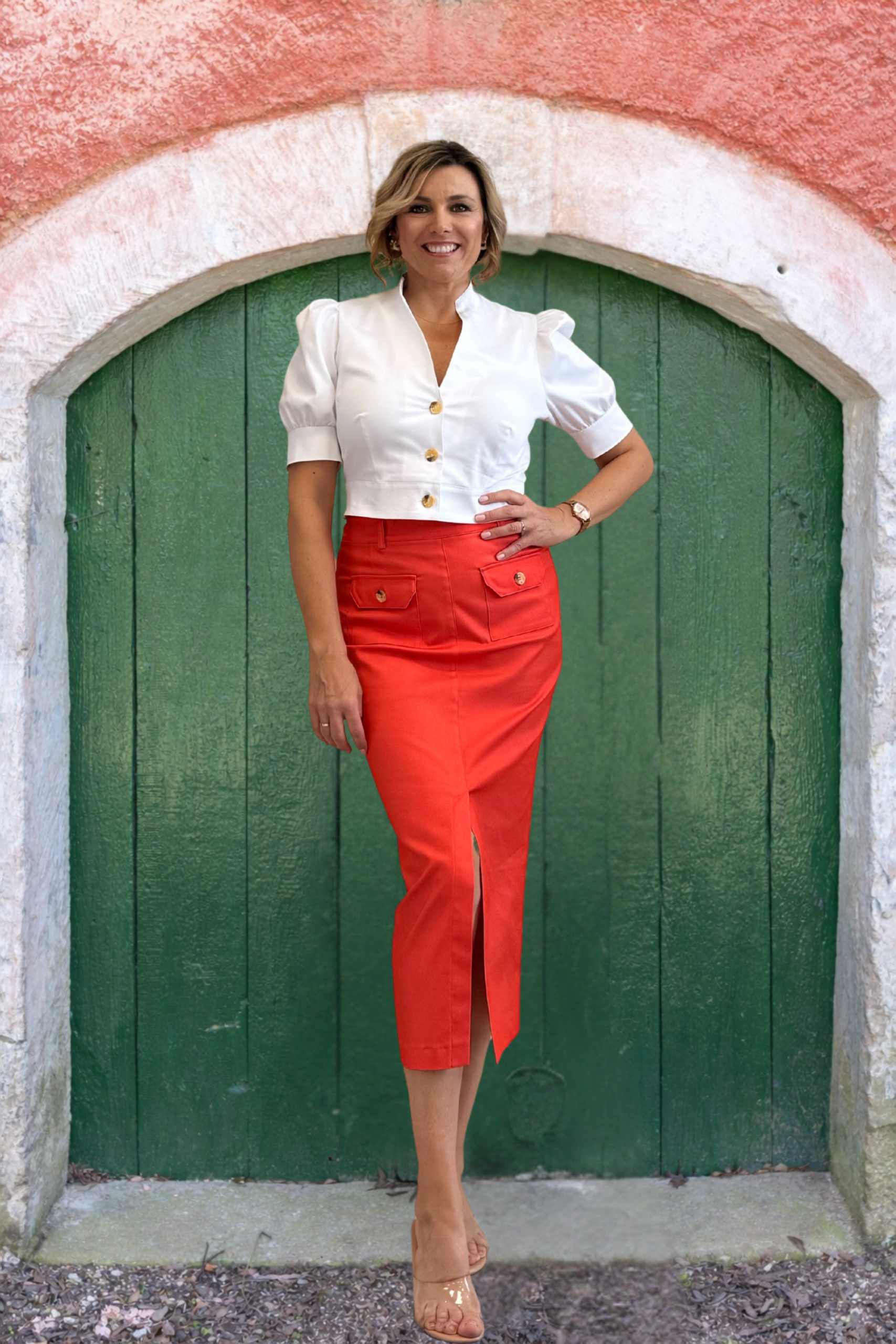 Ez a strukturált, egyenes szabású midi szoknya a letisztult nőiesség tökéletes megtestesítője. A magasított derékrész szépen formálja az alakot, míg a hosszított, egyenes vonal optikailag nyújtja a sziluettet. A zsebfedők különleges, mégis visszafogott dizájnelemként jelennek meg, karaktert adva a darabnak. A középső slicc nemcsak esztétikai, hanem praktikus funkciót is betölt, biztosítva a kényelmes mozgást a mindennapok során.