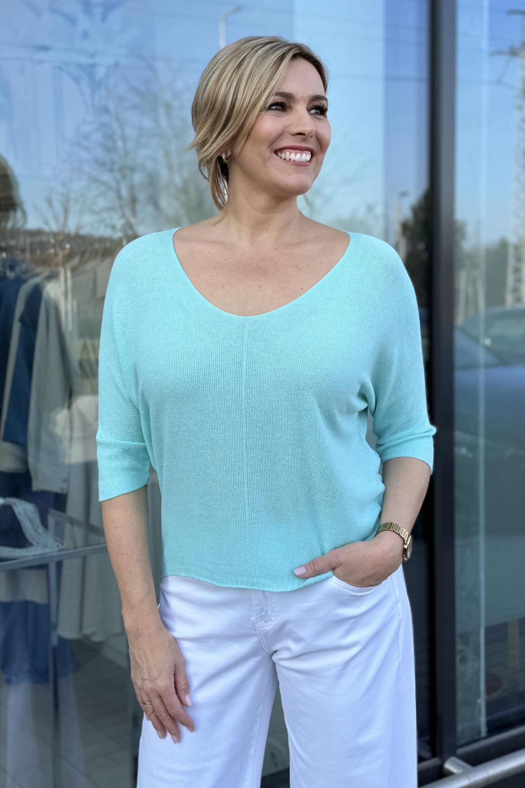 Ez a finom kötésű, V-nyakú kötött felső tökéletes választás a mindennapi megjelenéshez. Letisztult szabása és lágy esésű anyaga kényelmes viseletet biztosít, miközben nőies és modern megjelenést ad. A V-kivágás szépen keretezi a dekoltázst, a rövid, könyökig érő ujjak pedig légies, könnyed hatást keltenek.