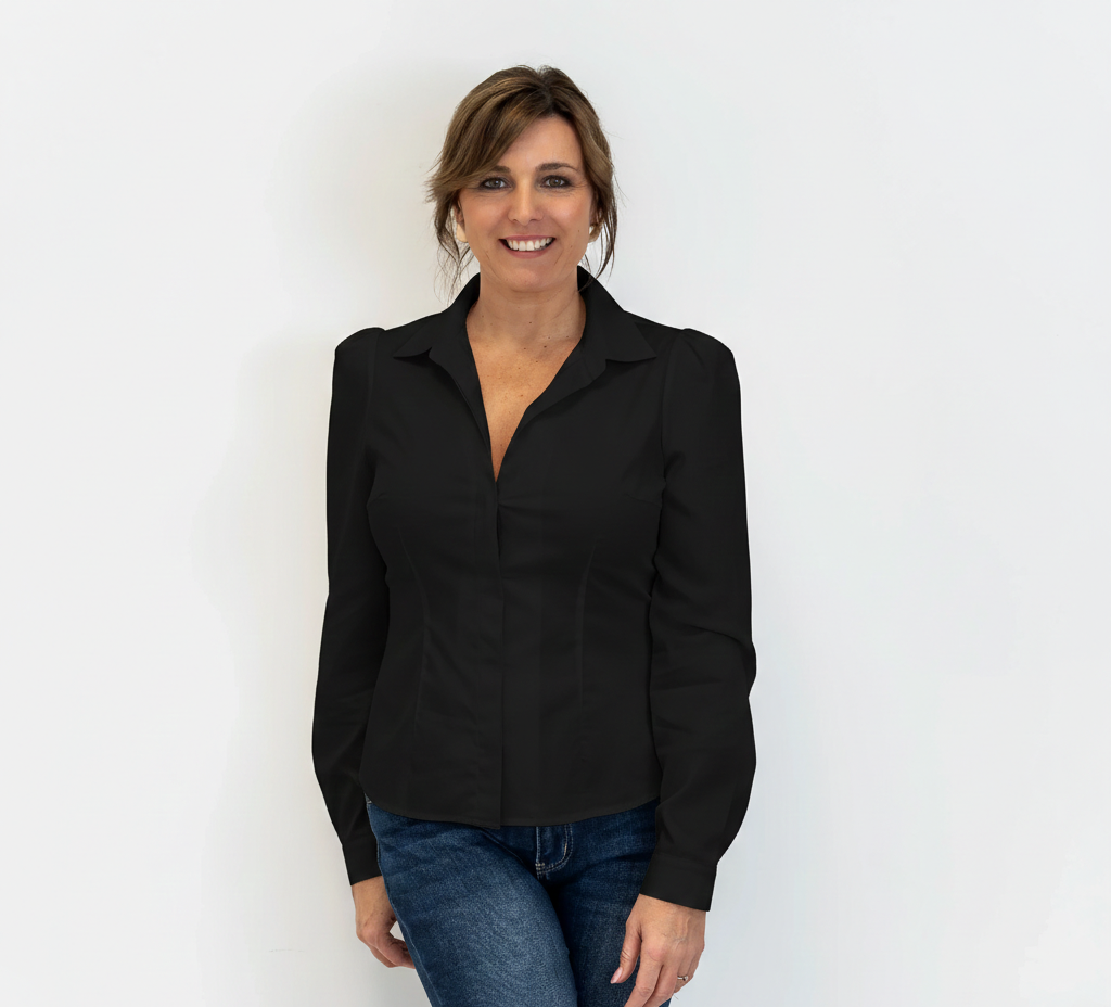 Pamut, rugalmas anyagú blúzunk álló gallérjával vagány megjelenést kölcsönöz viselőjének. Jól variálható nadrággal és szoknyával is. Hajtott vállmegoldása előnyös viselet a körte testalkatú hölgyeknek is.