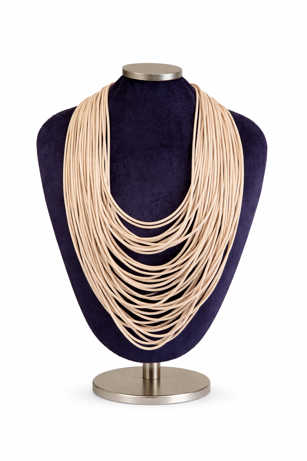 Elegáns, mégis könnyed nyaklánc, amely krém és barna árnyalatú zsinórok harmonikus rétegezésével emeli ki az öltözéket. Letisztult formája miatt tökéletes választás hétköznapi és alkalmi viselethez egyaránt. Különösen jól mutat egyszínű ruhákhoz, blúzokhoz, kosztümökhöz.